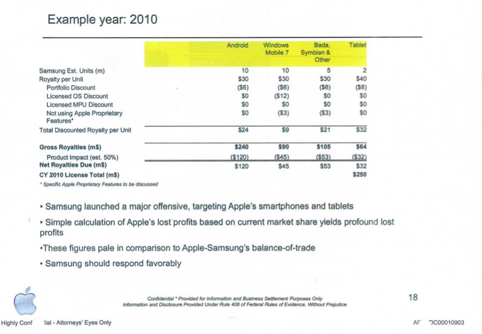 אפל האשימה את סמסונג בכך שזו חייבת לה בערך 250 מליון דולר, שזה הרבה פחות ממה שאפל מוציאה על רכיבים, והציגה תרשים במצגת המסביר את החישוב: