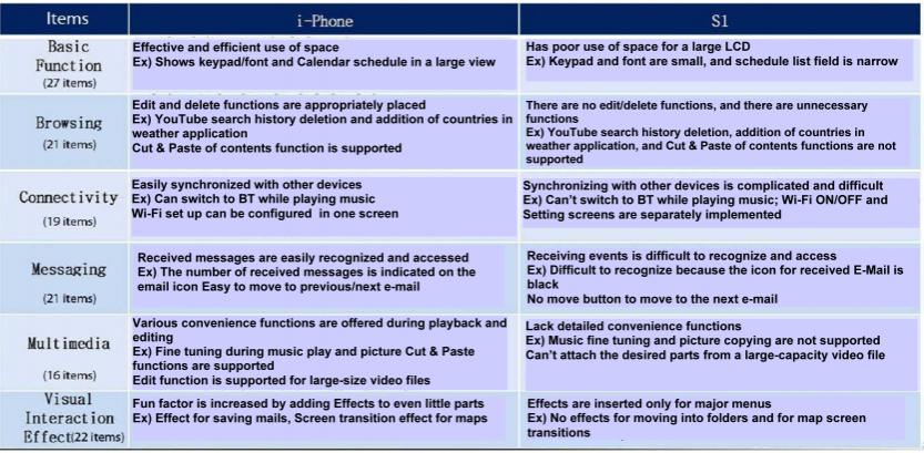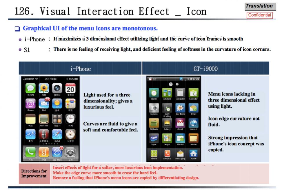באותו המשפט, אפל הציגה ב2 מסמסכים פנימיים של סמסונג בהם היא חשפה כי סמסונג השוותה את הגלאקסי 1 לאייפון כאשר היה בפיתוח. מסיבות כלשהן, היה חשוב לסמסונג לא ליפול מהאייפון ולכן החברה חקרה את הפיצ'רים של האייפון אל מול מה שהם הצליחו להשיג בגלאקסי כנראה כדי לבדוק עד כמה זה טוב.