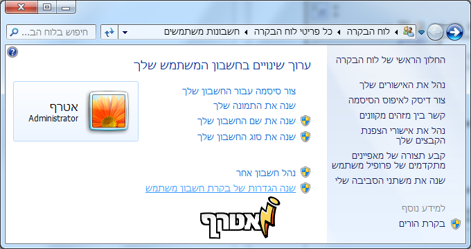 אז על מנת לשנות את ההגדרות, יש לגשת ללוח הבקרה, משם לחשבונות משתמשים, וללחוץ על שנה הגדרות של בקרת חשבון משתמש.