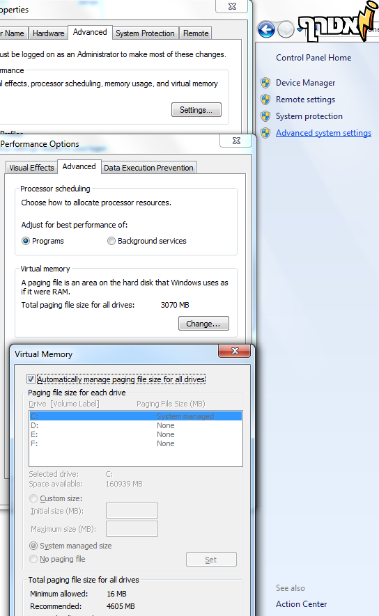 - ללא קובץ החלפה: ביטול אפשרות הזיכרון הוירטואלי, דבר אשר לא מומלץ בכלל.