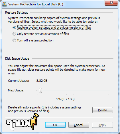 שחזור המערכת של Windows יכול להציל אותנו בהרבה מצבים מסוימים, אך גם תופס כברירת מחדל 5% משטח הדיסק שבו מותקנת המערכת. וזה יכול ליהיות הרבה, לכן תוכלו גם לשנות את האחוזים, או בכלל לבטל את האפשרות למקרים דחופים, למרות שדבר זה לא מומלץ. כמובן שככל שתפחיתו את כמות האחוזים - כך תוכלו לשמור פחות נקודות שיחזור, לכן יש לשמור לפחות 1%, אני ממליץ על ברירת המחדל, 5%, אתם כבר תבחרו.