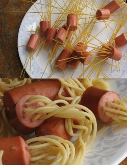 2. משפדים את הספגטי אל תוך הנקניקיות, בכל דרך יצירתית שתבחרו.