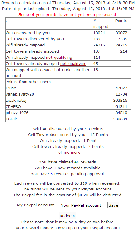 מה זה אומר? אתם הולכים והאפליקציה מזהה רשתות וממפה אותם. על כל רשת טלפונית חדשה (שלא מיפו אותה עדיין) תקבלו 15 נקודות, על כל רשת WiFi חדשה תקבלו 3 נקודות. על כל רשת טלפונית ישנה (שכבר מיפו אותה בעבר) תקבלו 2 נקודות ועל כל רשת WiFi ישנה תקבלו 1 נקודה. כאשר תגיעו ל-10,000 נקודות בפעם הראשונה יהיו לכם שתי אפשרויות או להוציא את הכסף ל-PayPal או להפוך לחברי Premium בחברה (חברות ה-Premium היא לכל הזמן).