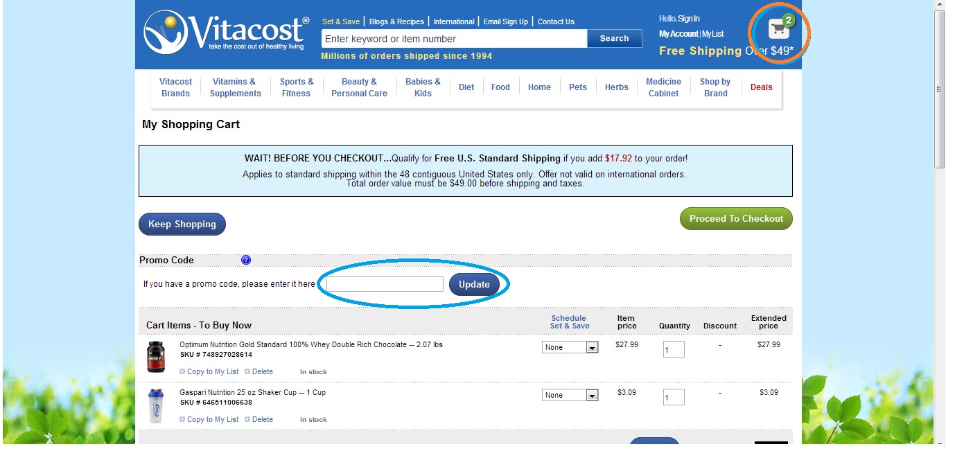 3.נכנסים לעגלת הקניות (למעלה מימין מסומן בעיגול אדום) ומכניסים את קוד הקופון שקיבלנו לתיבה (מסומן בכחול) ולוחצים UPDATE בשלב זה אמורים לראות את ההנחה (המחיר ירד ב10$).