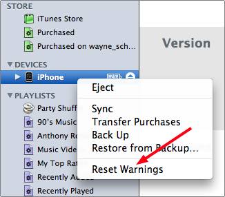 אחרי זה תלחץ קליק ימני על האייפון שלך באייטונס, ותעשה RESET WARNINGS כמו בתמונה: