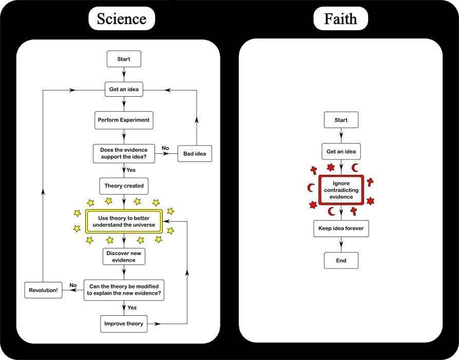 המדע-אוספים עובדות,ממצאים,תצפיות וממצאים ורק לאחר מכן מסיקה מסקנה/מסקנות העולות מהממצאים הללו ולבסוף היא מנסחת תאוריה שמסבירה את העובדות.אם מוצאים מספיק ראיות שסותרות את התיאוריה אז מנסחים תיאוריה חדשה,זוהי גדולתו של המדע,הוא מתקן את עצמו לפי הממצאים ולא נשאר מקובע ברעיונות עתיקים.