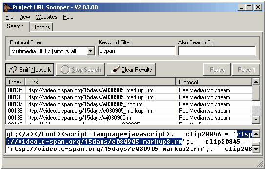 URL Snooper was written to help users locate the urls of audio and video files so that they can be recorded. Many links to streaming audio and video that you come across on the web are hidden behind javascript or activex scripts. Because of this, it is sometimes very difficult to figure out the actual urls that correspond to the streams being played. The goal of is to provide a one-stop easy solution to finding the URLs for all streams. It does this by watching network traffic and identifying potential urls, especially streaming media urls.