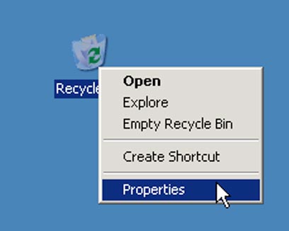 מצאו את סל המיחזור בשולחן העבודה, והקליקו עליו עם הלחצן הימני בעכבר, שם בחרו ב-Properties ("מאפיינים").