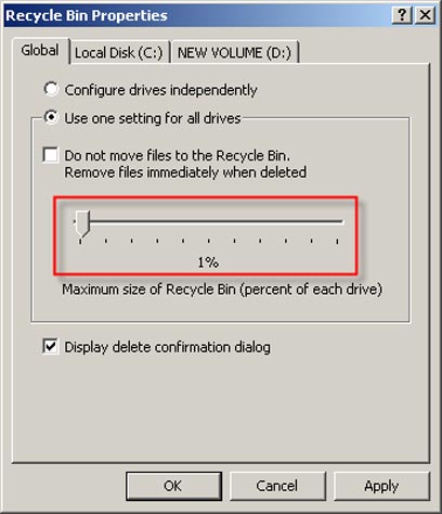 אם במחשב שלכם מותקנים מספר כוננים קשיחים, או שהכונן מחולק למחיצות (Partitions), תוכלו לבחור בין שתי אפשרויות: הראשונה – להגדיר עבור כל כונן את גודל סל המחזור שלו (נוח אם יש כונן בו יש קבצים כבדים יותר כמו סרטים); השניה (מומלצת למתחילים) – להשתמש בהגדרה אחת עבור כל הכוננים הקשיחים.