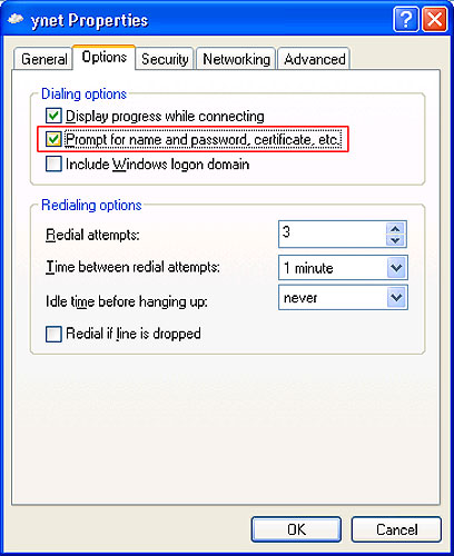 כך עושים זאת ב-Windows XP: בשלב הראשון, יש להיכנס ל-My Computer ואז ל-Control Panel ול-Network Connections (המחשב שלי, לוח הבקרה, חיבורי רשת). יש לבחור את החייגן מהרשימה ולהיכנס למאפיינים שלו, באמצעות קליק ימני ובחירה ב-Properties. יש לגשת ללשונית השנייה, Options (אפשרויות), ולהסיר את ה-V שמסומן ליד "Prompt for name and password" (דרישת שם משתמש וסיסמה - זה יגרום לחייגן לדלג על שלב החיוג).