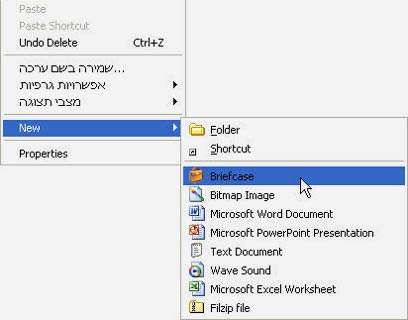 ראשית יש ליצור את המזוודה. לחצו על כפתור העכבר הימני בכל תיקיה (אצלנו זה על שולחן העבודה, מאוד פשוט ונוח) ובחרו "חדש" ואז "מזוודה" (New - Briefcase). כעת תופיע צלמית מזוודה בתיקיה. לחצו עליה פעמיים על מנת לפתוח את המזוודה.
