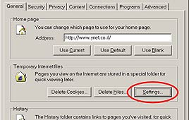 מקליקים על הכפתור Settings שבמסגרת Temporary Internet Files.
