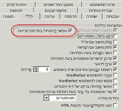 אז תצטרכו לבחור בתווית כללי (General) ולבסוף להוריד את האפשרות: "אפשר להתחיל בפריסת קריאה" (Allow starting in Reading Layout).