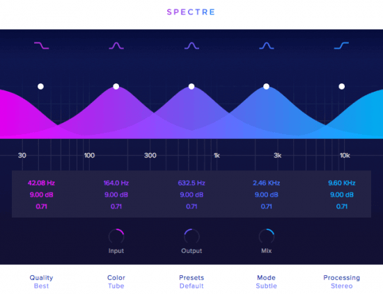 Spectre brings colours and life to the sound. It makes dull recordings sound bright, it can make a bass track more suitable for small speakers and it can even work as a high-end stereo widener thanks to the mid/side matrix.