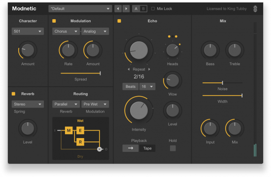 MODNETIC offers comprehensive emulation of classic analog tape delay hardware from the 1970's. No mere slavish analog emulation, MODNETIC also has a few digital twists.