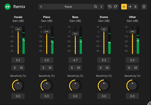 Remix is the first plug-in capable of separating instrument groups in a mix - so called stems - in real-time with an acceptable latency. Remix uses cutting edge technology based on artificial intelligence to separate complete mixes into five stems - Vocals, Piano, Bass, Drums and Other. These stems can be remixed so that you can easily increase the level of the vocals, reduce the level of the drums or even create a karaoke version.