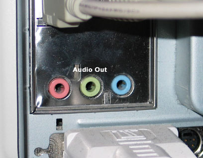 נחפש באחורי המחשב את יציאת האודיו המתאימה, היא מסומנת בדרך כלל בצבע ירקרק, זוהי ה-Audio Out, זוהי יציאת אוזניות סטנדרטית (3.5 מ"מ).