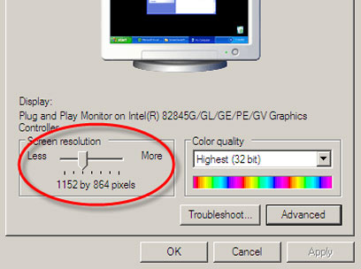 - עומדים עם סמן העכבר על מקום ריק בשולחן העבודה, מקליקים על הלחצן ימני בעכבר, בוחרים ב-Properties, אחר כך יש לבחור את לשונית ה-Settings ושם להגדיר את הרזולוציה המתאימה (מתחת ל-Screen Resolution) - כדאי לבחור ב-800X600 ב-CRT או 1360x768 במסכי LCD.
