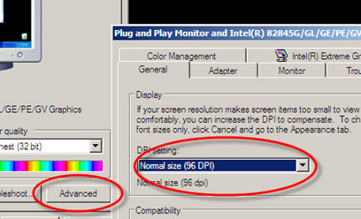 - אם זה לא מספיק, ניתן גם להגדיל את גודל הגופנים במסך: באותו חלון של הגדרת רזולוציה, לוחצים על Advanced בפינה הימנית תחתונה של החלון. בחלון החדש שנפתח (בלשונית General), בוחרים את גודל ה-DPI הרצוי (ברירת המחדל הינה 96 DPI).