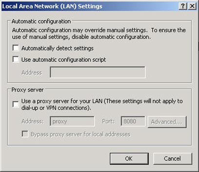 כעת הקליקו על הכפתור "הגדרות LAN". בתיבת הדו-שיח המופיעה, הסירו את הסימונים מכל התיבות, במיוחד זו המסומנת Automatically detect settings. הקליקו על OK, ואז שוב, OK. עכשיו, כאשר תפעילו את הדפדפן, הוא יתחיל לעבוד מייד במקום להשתטות בחיפוש אחר משהו שלא קיים.