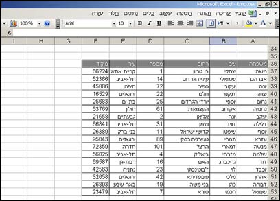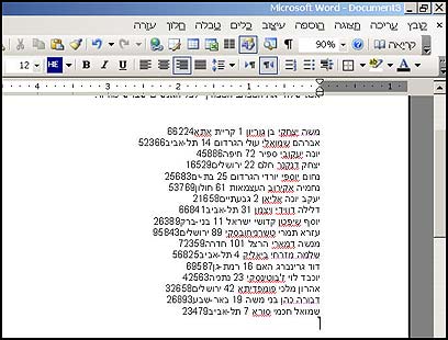 התוצאה, כפי שאפשר לראות, לא תמיד מושלמת. צריך לעצב אותה, ובדוגמא פיקטיבית שלנו - להוסיף רווחים לפני המיקוד בכל שורה, ואולי גם פסיק אחרי השם.