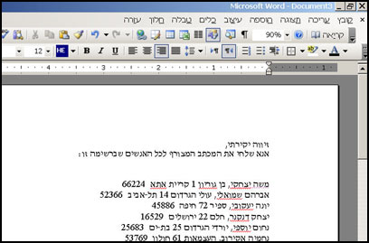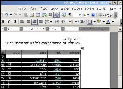 אנחנו רוצים לשלב את הרשימה במכתב, לכן נסמן את התאים הרלוונטיים ואז נעתיק (Ctrl-C) ונדביק (CTRL-V) במסמך Word.