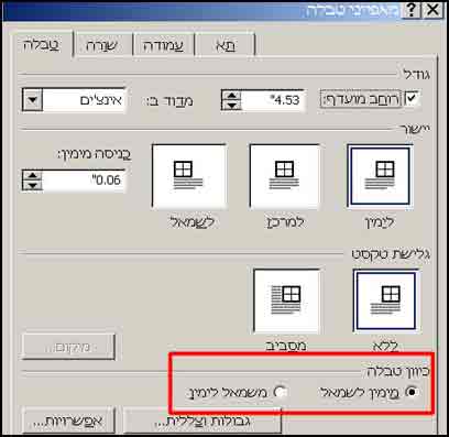 אם זו טבלה באנגלית, והכיוון שלה התהפך, זה הזמן לתקן אותה: מסמנים את הטבלה שהודבקה, מבצעים קליק ימני ונכנסים למאפייני טבלה. בכיוון הטבלה בוחרים משמאל לימין.