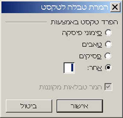 כדי לעשות את זה נסמן את הטבלה ונבחר מהתפריט הראשי של התוכנה טבלה / המר / טבלה לטקסט. בחלון הקטן שיוצג נוכל לבחור איך להפריד בין הנתונים שיוצגו בכל שורה. הפתרון הכי נוח הוא להפריד ברווחים, ולשם כך נסמן את האופציה אחר ונקליד רווח אחד בחלונית הקטנה, ונאשר.