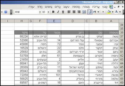 טבלת ה-Excel שבתמונה כוללת שמות וכתובות של 15 אנשים. הנתונים עצמם לא חשובים אבל שימו לב למבנה הטבלה.