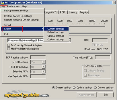 לפני הכל, מומלץ לבצע גיבוי למצב הגדרות הרשת הקיימות שלכם. בתפריט File בחר Export ושמרו את ההגדרות הנוכחיות (current settings) בקובץ על פי בחירתך. אם משהו משתבש מסיבה כלשהי, תוכל תמיד לחזור להגדרות האלה על ידי ביצוע Import לקובץ הגדרות הגיבוי, Apply והפעלה מחדש של המחשב.