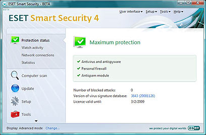 חברת ESET השיקה לאחרונה את גרסה 4 של חבילת ההגנה שלה, שמצליחה לשלב בין הדרישות האלו בצורה טובה - ההתקנה פשוטה ומהירה, אין הכרח לשנות את הגדרות ברירת המחדל, העדכונים מתבצעים בצורה אוטומטית וההגנה לא משפיעה על ביצועי המחשב. לאחר שהתוכנה מתחילה לתפקד היא מזהה חיבור לרשתות אלחוטיות ומבקשת עבורן אישור גישה, אבל מכאן ואילך היא לא מציקה לגבי אישור גישה לרשת עבור כל תוכנה שמתחברת אל האינטרנט. במהלך סריקה מקיפה של מחשב עמוס בכל טוב תרגישו בעומס קל על המערכת, אבל עדיין אפשר לעבוד איתו בלי לצאת מהכלים.