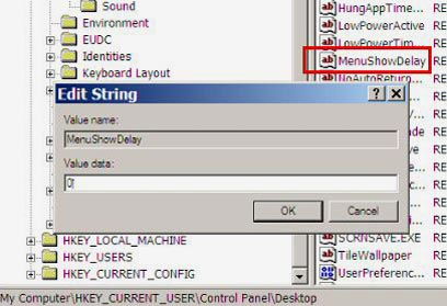 ב. בחלק הימני של החלון, מחפשים את הערך MenuShowDelay. מסמנים אותו ומבצעים הקלקה כפולה כדי להיכנס לחלון העריכה.
