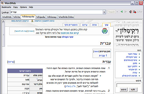 המילון המובנה של WordWeb לא כולל ערכים בעברית, אבל הוא מזהה מילים בעברית ובמקום המילון המובנה מציג אוטומטית תוצאות חיפוש מוויקיפדיה, או מוויקימילון.