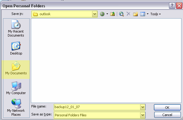6. בחר את המיקום והשם שאתה מעוניין להשתמש בכדי לגבות את הקובץ ( שים לב למיקום כך שתיזכור איכן הקובץ מצויי מאוחר יותר) אני שמרתי בתיקיה Outlook על שולחן העבודה.