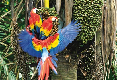 על שפת הנהר ניצבו דקלים רבים. הרמנו את עינינו אל על, והלסת התחתונה שלנו סירבה להתרומם: ציפורי מקאו היו בכל מקום, בצבעים שהבדילו בין המינים השונים – מראה מרהיב מאין כמוהו. ביערות הגשם, כאשר נשאלת השאלה: מה יותר מסוכן – להיראות ולהסתכן בכך שיטרפו אותך או להבליט צבעים כדי שלא להתחבר בטעות לזוגתו של השכן, מנצחת כמובן הבחירה השנייה, שכן – פרט ליגואר שלא ממש מטפס על עצים, לעופות הדורסים קשה לתקוף בין ענפי העצים, כך שחשוב יותר לבלוט.