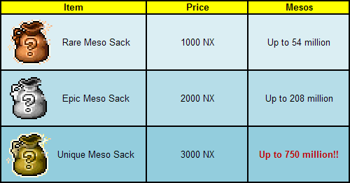 לאחר שבידכם לפחות 3000NX, הכנסו לCashShop ותקנו Unique Meso Sack.
