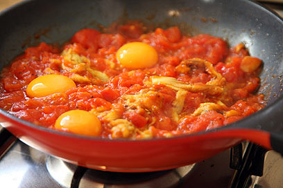 - יוצרים שקעים קטנים ברוטב, יוצקים לתוכם 2-3 ביצים/חלמונים (תחילה לקערית קטנה, ליתר בטחון), מכסים במכסה ומבשלים על אש קטנה עד למידת העשייה הרצויה. לביצים עשויות היטב יש לבשל במשך 12-13 דקות. מסירים מן האש, מצננים 3-5 דקות ומגישים עם לחם טרי.