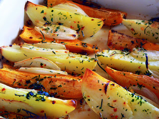 תפוחי אדמה ובטטה צלויים בשום, מוסקט, קארי ורוזמרין