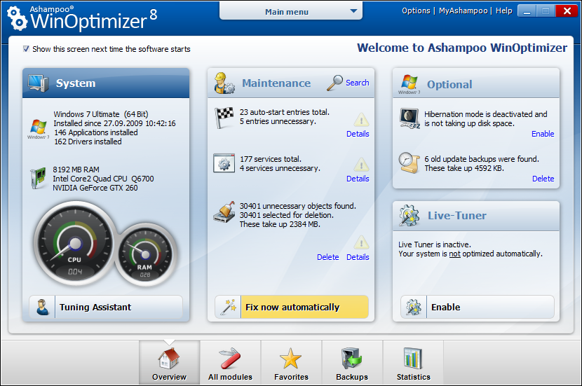 חבילת אשמפו מייעל-וינדוס פלטניום הוא יורש חדש ורב מאוד לחבילת אשמפו ייעול-וינדוס. עם כל הממשקים וכל התכונות החדשות הוא לא מאפשר לנצחו עם חבילת כלי הניקוי אשר ישאירו את התקנת וינדוס דלילה, דל והרצה חלקה ללא שגיאות ותקלות. כולל את הפונקציות: מנקה דיסק-קשיח. מנקה רגיסטרי. מנקה אנטרנט. מנקה DLL. כוונון האנטרנט. כוונון אתחול המחשב. מחבר קבצים. מנקה קבצים. חוסם פופ-אפ.כמו שלכלוך וזבל מצטבר במבנים ומפעלים במשך הזמן, נתונים מיותרים ו"קבצים שנותרו" בהדרגתיות בכל התקנות וינדוס בעת השימוש. כמו שזבל זה מתאסף לאט, הוא מבצע איטיות במערכת ההפעלה שלך ולוקח את מהירות המחשב, ביצוע פעולות וביצועי המערכת לאיטיים ואיטיים יותר.זהו חלק טבעי של תהליך ותוצאות שמערכת ההפעלה וינדוס עוצבה.חבילת אשמפו מייעל-וינדוס הוא כמו שיש לך חברת נקיון עבור מחשב וינדוס. כמו מנקה מקצועי, התוכנה יודעת במדוייק איזה סוג זבל ולכלוך לחפש, היכן למצוא אותו ואיך להפטר ממנו בצורה יעילה בלי לגרום למשהו אחר נזק.לחבילת אשמפו מייעל-וינדוס יש 8 כלים רבי-עוצמה וקלים לשימוש עבור ניקיון, כוונון וייעול מערכת הוינדוס שלך