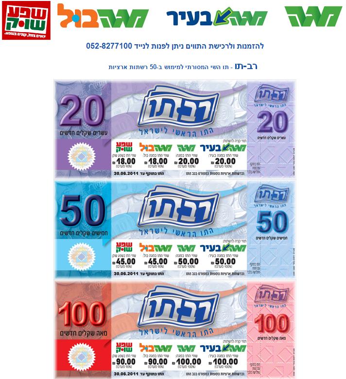 בתו-הזהב אפשר להשתמש בשופרסל, ברב-תו אפשר להשתמש במגה ומאחורי התו כתובות שאר החנויות שאפשר להשתמש בתווים.