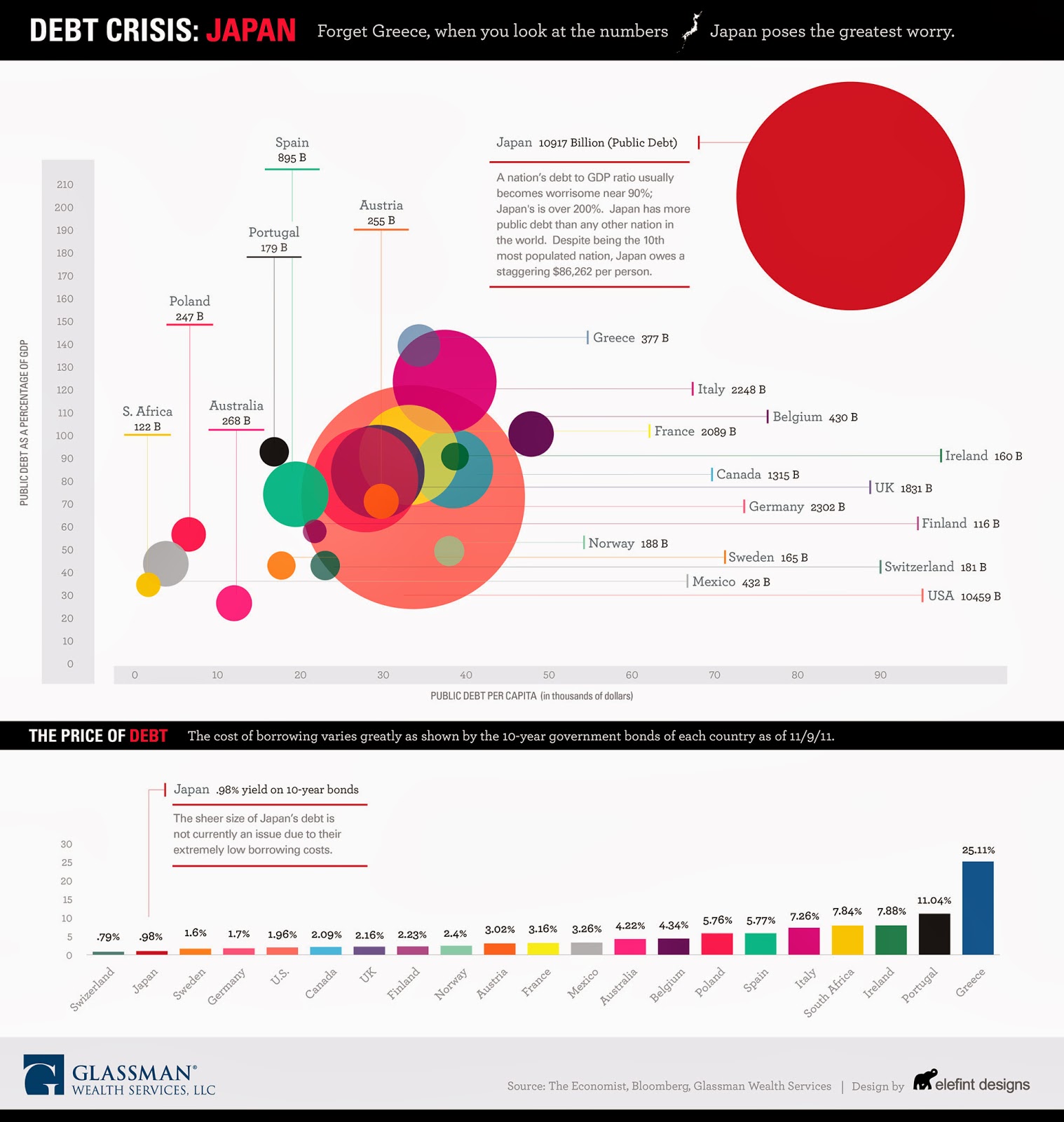 במפה אנחנו רואים שהכלכלה בעלת החוב הגדול ביותר היא יפן החוב שלה הוא פי 2 מהתמ"ג ליתר דיוק 220%.