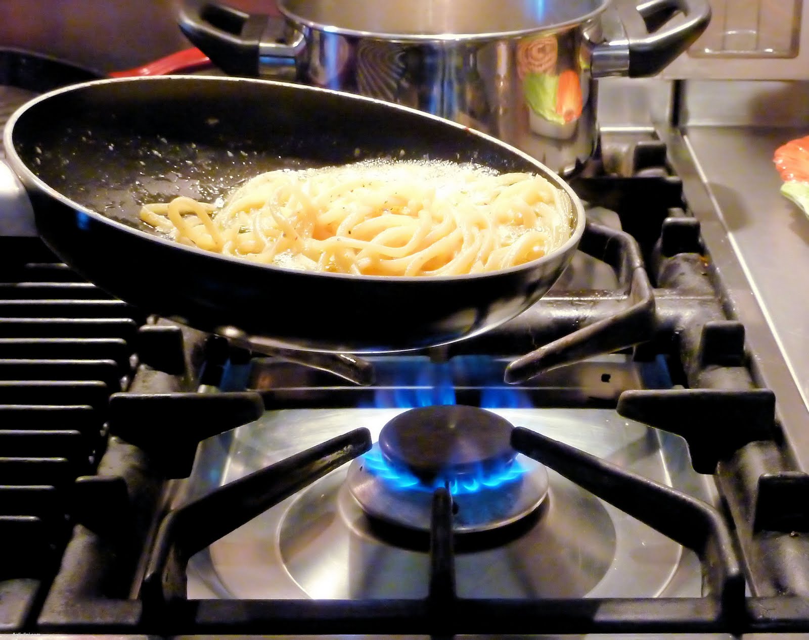 במחבת עם שוליים גבוהים ממיסים את החמאה ומיד מכבים את האש, כאשר האטריות מוכנות מסננים ומעבירים למחבת מערבבים היטב עם מרגישים שזה יבש מדי מוסיפים מצקת מהמים בהם התבשלו האטריות.