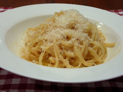 מפזרים מלמעלה את הפרמזן אגוז המוסקט והפלפל השחור. יש להיזהר לא להוסיף מלח כי במי הבישול היה מלח והפרמזן גם הוא מלוח.