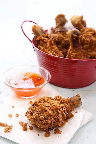 - מורחים את שוקי העוף במשחה ומגלגלים בפירורי החטיף. מניחים בתבנית.