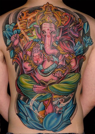 קעקוע גאנש - האל בעל ראש הפיל הוא אחד האלים הפופולאריים ביותר בהודו. אל ההצלחה וההתגברות על מכשולים , גשמיים ורוחניים כאחד. גנש הוא אלו של האדם הפשוט, ואכן כמעט בכל בית ניתן למצוא את דמותו שמשייכים לה גם את תפקיד שמירה והגנה על הבית. הוא גם אחראי על החינוך והמסחר. הוא יופיע בפוזות שונות יושב, עומד ואפילו רוקד. בידיו הוא יחזיק לרוב מחרוזת תפילה המסמלת את הרדיפה אחרי ידע ובידו השנייה גרזן כסמל לסילוק מכשולים והוא גם מזרז את האדם שלא ינוח במסעו להשגת הארה רוחנית. ישנן הרבה אגדות המסבירות כיצד הגיע גאנש ל"ענוד" ראש של פיל. אחת מספרת שגאנש בנם של שיבא ופרווטי היה חולה מאד בראשו ונזקק לטיפול, החיה הראשונה שעברה לפניהם היתה פיל ולא היתה להם ברירה אלא להחליף את ראש בנם החולה בראשו של הפיל והשאר היסטוריה....