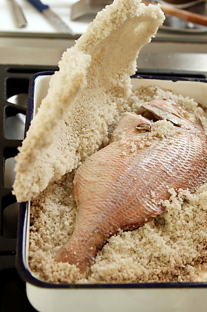 בעזרת האצבעות מזלפים מעט מים על פני מעטפת המלח ומהדקים אותה בעדינות לגופו של הדג.