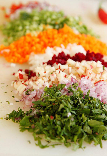 קוצצים את כל הירקות לקוביות הכי הכי קטנות שאפשר, ממש פיצפוניות.