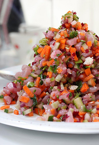 חותכים את בשרו של הדג לקוביות קטנות, כמו שהיתם חותכים להכנת טרטר. לשם כך כדאי לבחור דג שבשרו מוצק יחסית ואינו מתפרק בחיתוך. פלמידות למשל לא יתאימו פה.